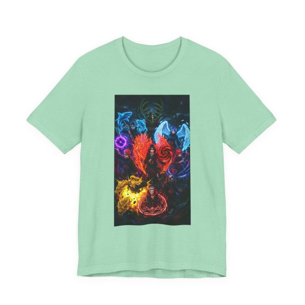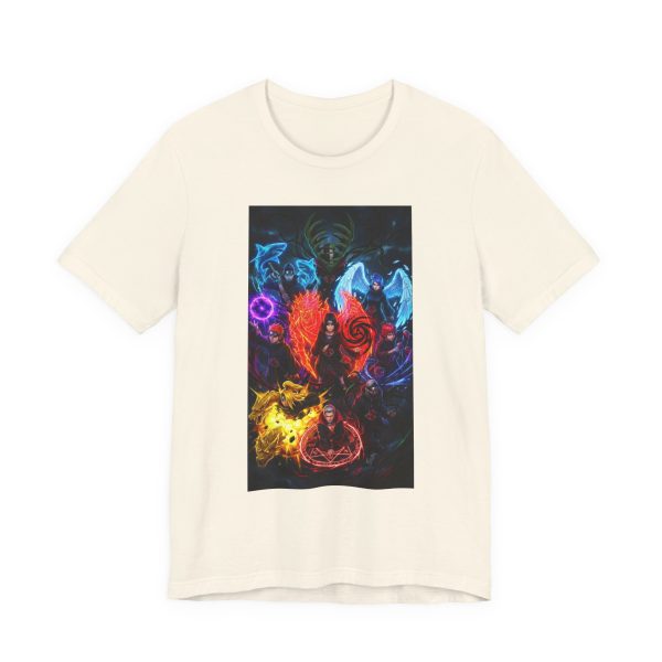 This lightweight cotton tee carries a bold, otherworldly illustration—vivid elements of flame, water, ice and shadow swirl around a central, hooded figure. Wear it when you want your outfit to feel like a story: moody late-night hangs, gaming sessions, convention days, or when you’re layering for a streetwise look. The image sits as a striking rectangular panel on the chest, giving a gallery-like splash without overwhelming the shirt’s clean white canvas. It breathes easily, drapes neatly, and holds up to repeated wears while keeping the design sharp and vibrant.