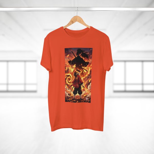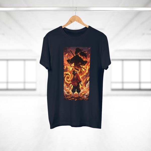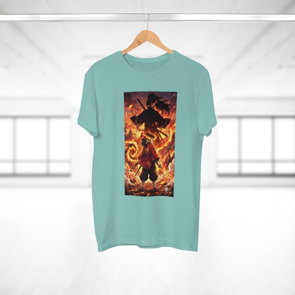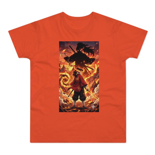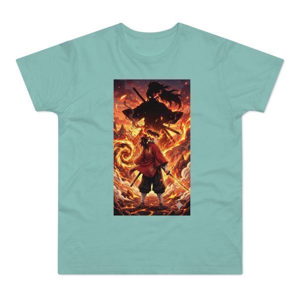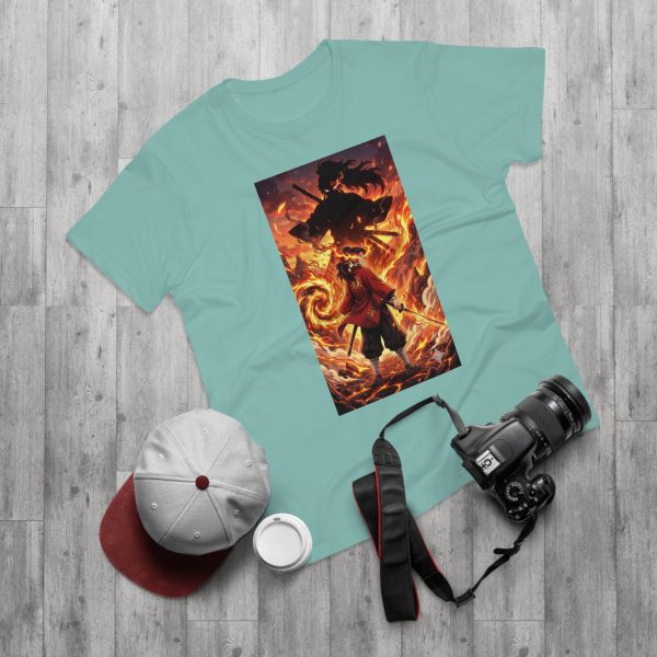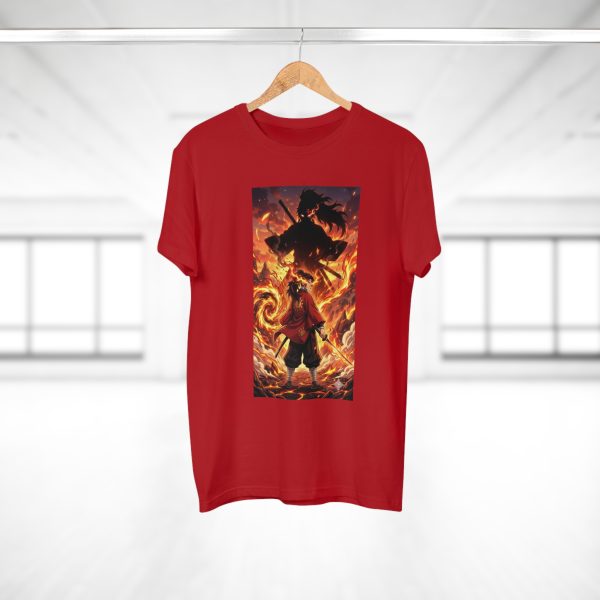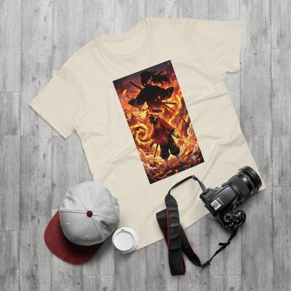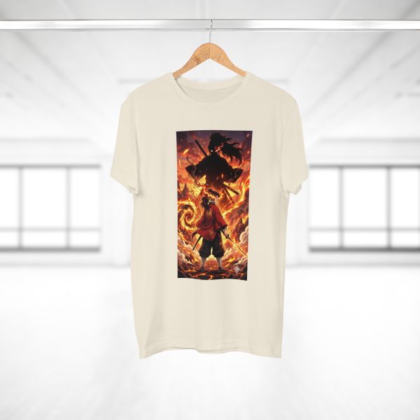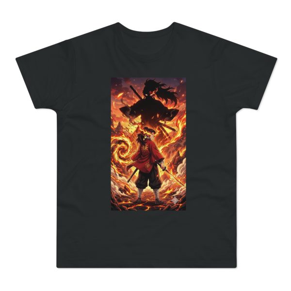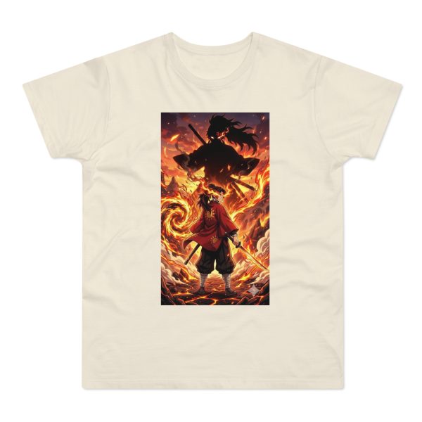 This lightweight cotton tee carries an adventurous, anime-inspired energy. The front features a bold, vertical artwork of a lone hero standing before a towering, shadowed figure and swirling flames — colors and motion that feel alive. Wear it when you want to channel that spirited, battle-ready mood: layered under a jacket for city nights or worn solo on warm days. The soft, breathable knit moves with you and keeps the art front-and-center, making it easy to show your fandom without shouting. It settles comfortably into everyday routines — training, meetups, con panels, or long commutes — and feels familiar the moment you put it on.